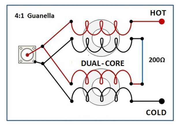 此類型巴倫有時也稱電流巴倫,其可保證兩個輸出端的輸出電流相等,但輸出電壓不一定相等。同軸電纜內(nèi)部的電流大小相等且相位相反,因此其所產(chǎn)生的磁場強度相等且方向相反,而且在大部分情況下可相互抵消。當將變壓器巴倫與傳輸線變壓器巴倫組合時,可實現(xiàn)極寬的工作帶寬。人們常將Guanella傳輸線變壓器和巴倫組合用作阻抗匹配變壓器。