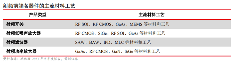 射頻前端器件采用特殊制造工藝,工藝壁壘較高。在射頻前端芯片中用到了多種半導(dǎo)體材料和工藝,如在射頻開關(guān)、射頻低噪聲放大器和射頻功率放大器上用到的RFSOI、RFCMOS、GaAs、MEMS、SiGe、GaN等材料和工藝以及在射頻濾波器上用到的SAW、BAW、IPD、MLC等材料和工藝。