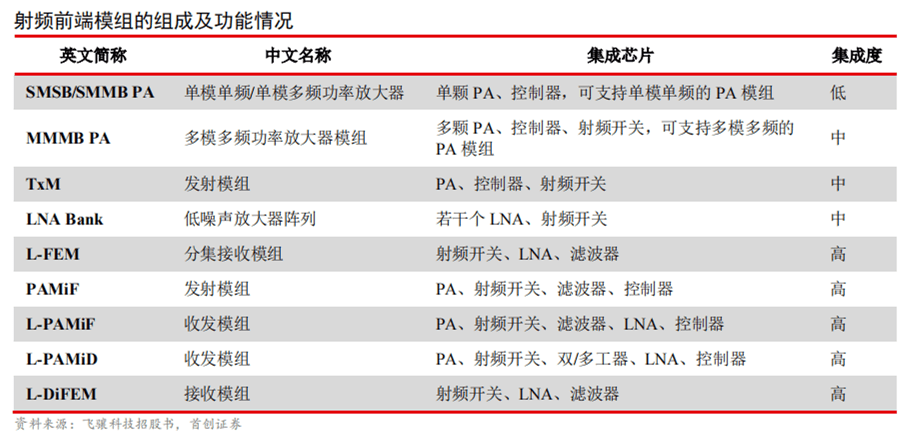 在無線移動(dòng)終端設(shè)備中,射頻前端還以集成了不同射頻器件的模組形式進(jìn)行應(yīng)用。伴隨手機(jī)等移動(dòng)終端功能復(fù)雜性的增加,主板面積日益擁擠,射頻前端向模組化方向發(fā)展趨勢(shì)明顯。射頻模組由多個(gè)射頻前端分立器件集成,射頻模組中集成的射頻器件數(shù)量越多,則模組的集成度越高。以高集成度模組L-PAMiD為例,其由射頻功率放大器、射頻開關(guān)、雙/多工器、LNA和控制器集成。