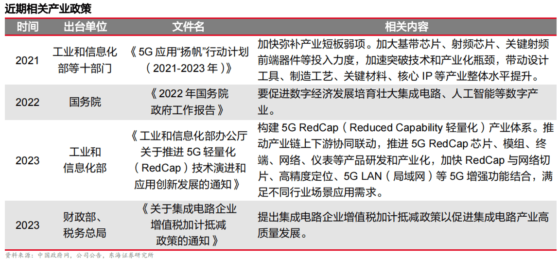 近年來,為提高集成電路行業(yè)的戰(zhàn)略地位,政府機(jī)構(gòu)持續(xù)頒布相關(guān)產(chǎn)業(yè)政策,規(guī)范行業(yè)發(fā)展秩序,在資金、稅收、人才等領(lǐng)域支持集成電路產(chǎn)業(yè)發(fā)展,其中,有關(guān)5G和半導(dǎo)體產(chǎn)業(yè)相關(guān)政策頻出,同樣為射頻前端的國產(chǎn)替代步伐保駕護(hù)航。