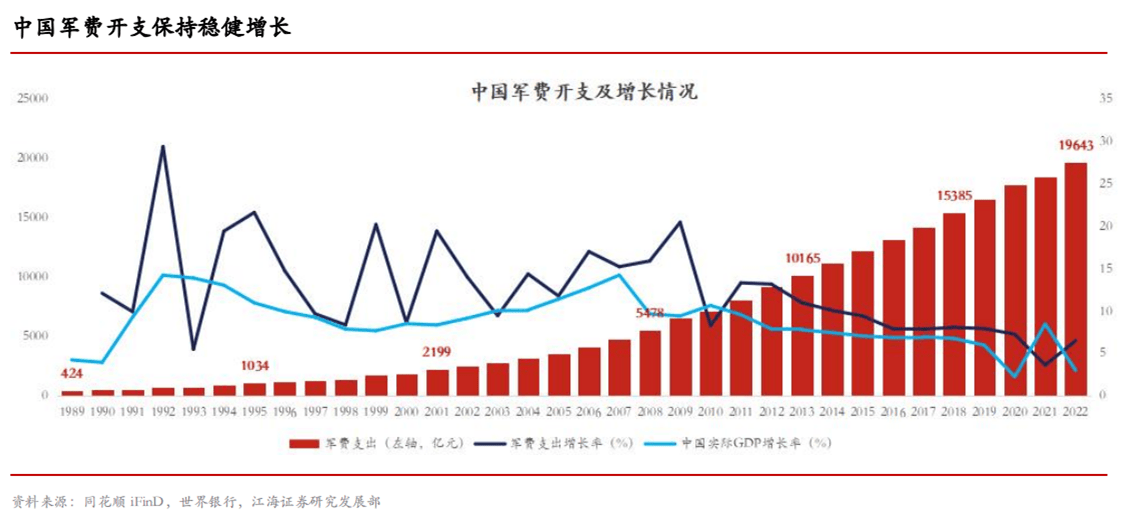 考慮到近年來全球地緣政治的不穩(wěn)定性,預(yù)計(jì)我國軍費(fèi)開支仍將保持穩(wěn)健增長,并且整體增速將繼續(xù)高于GDP的實(shí)際增速6.66%;另外根據(jù)中國財(cái)政部發(fā)布的2023年《政府預(yù)算(草案)》報(bào)告顯示,2023年我國國防費(fèi)預(yù)算約為1.55萬億元,同比增長7.2%,回顧2020—2022年,國防預(yù)算增速分別為6.6%、6.8%、7.1%,同樣保持穩(wěn)健增長。