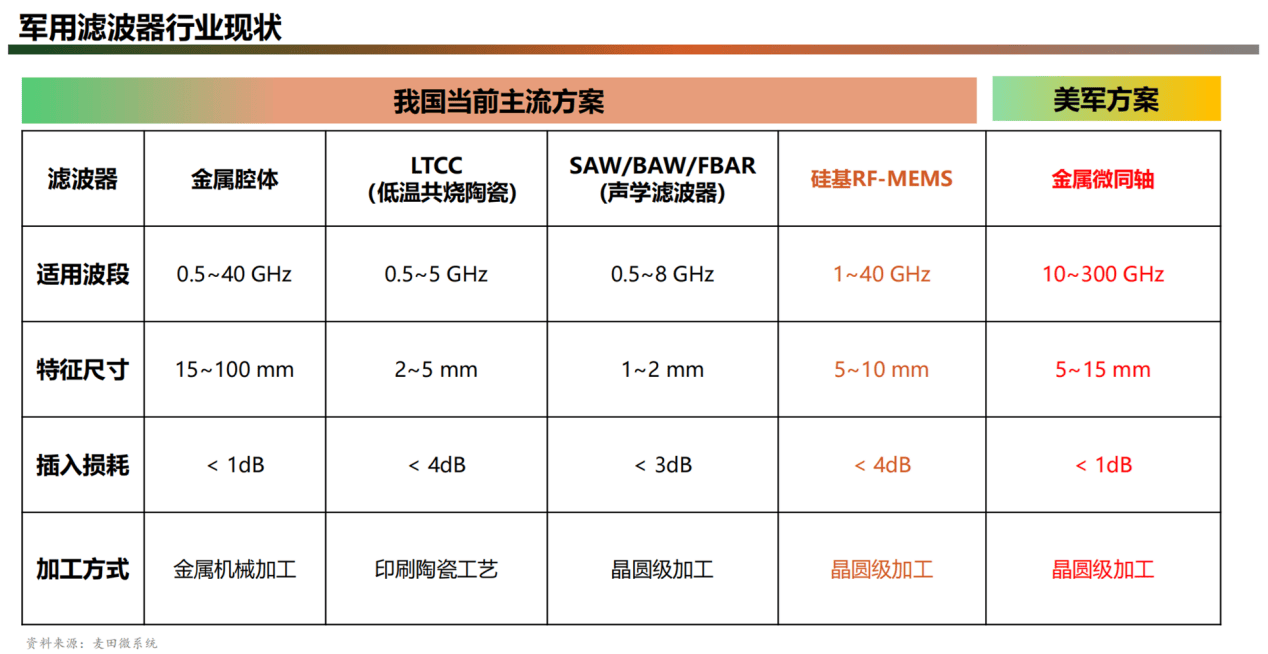 在軍用領(lǐng)域,微波組件領(lǐng)域以軍工央企為主體,民營企業(yè)依靠特色技術(shù)占據(jù)部分市場(chǎng)。微波組件軍民技術(shù)相通,頻率、功率逐步走向融合,民參軍成為大勢(shì)所趨;民用微波組件高度依賴進(jìn)口。民用通信中的微波組件除部分濾波器外,其余絕大多數(shù)來自進(jìn)口。